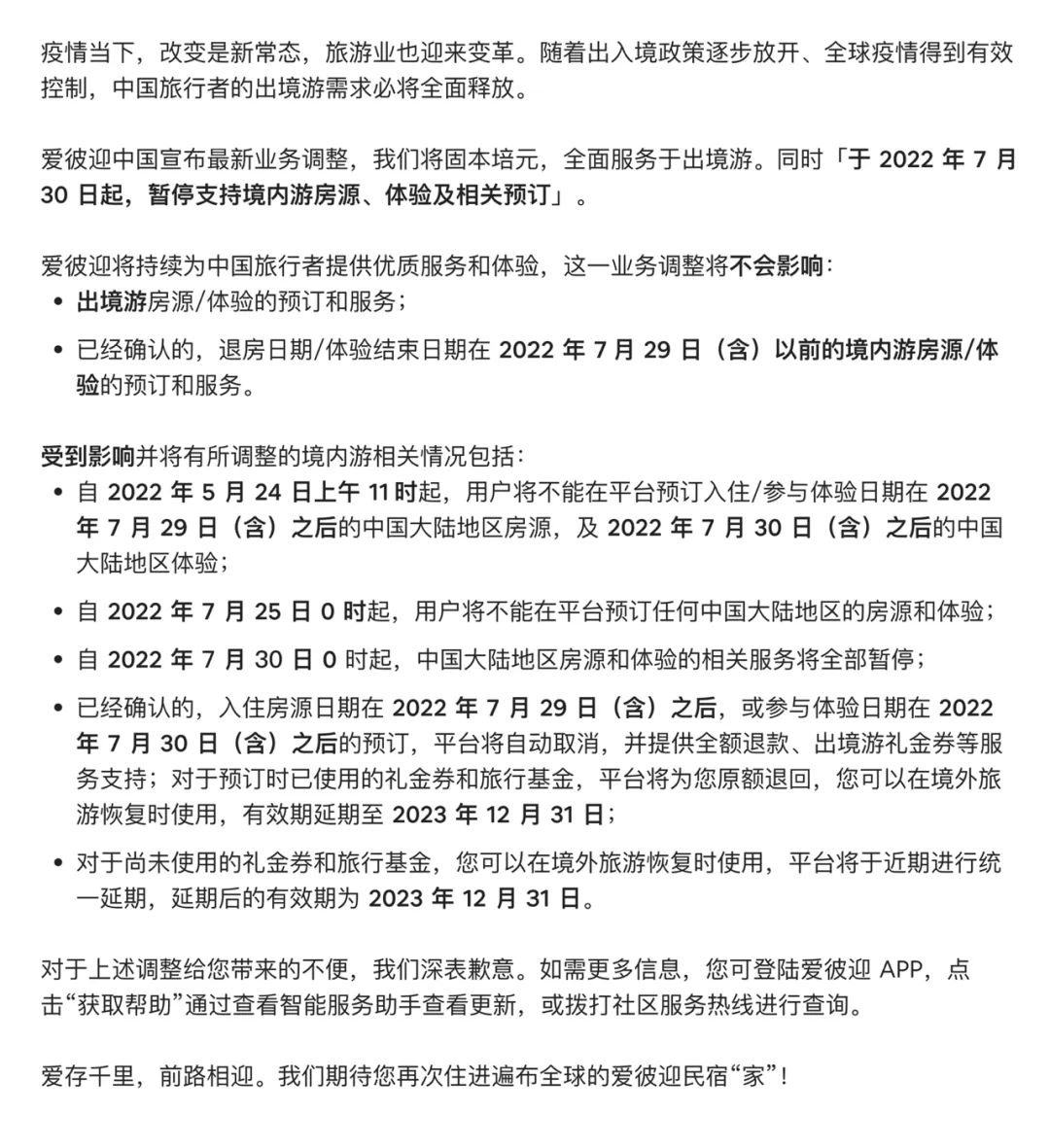 5月24日,愛(ài)彼迎Airbnb宣布從2022年7月30日起,將暫停支持中國(guó)境內(nèi)游房源、體驗(yàn)及相關(guān)預(yù)訂業(yè)務(wù),并為房東和用戶免除2022年5月24日至2022年7月29日期間所有境內(nèi)游訂單服務(wù)費(fèi),將只專注于出境游業(yè)務(wù)。