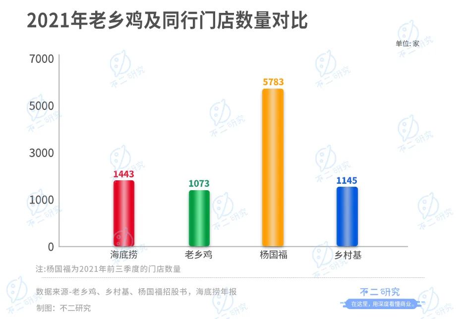 相比同賽道玩家,老鄉(xiāng)雞的門店規(guī)模并不算出眾。截止2021年,鄉(xiāng)村基擁有門店數(shù)量1145家;海底撈門店數(shù)量共1443家;2021年三季度,楊國福門店總數(shù)已達(dá)到5783家。