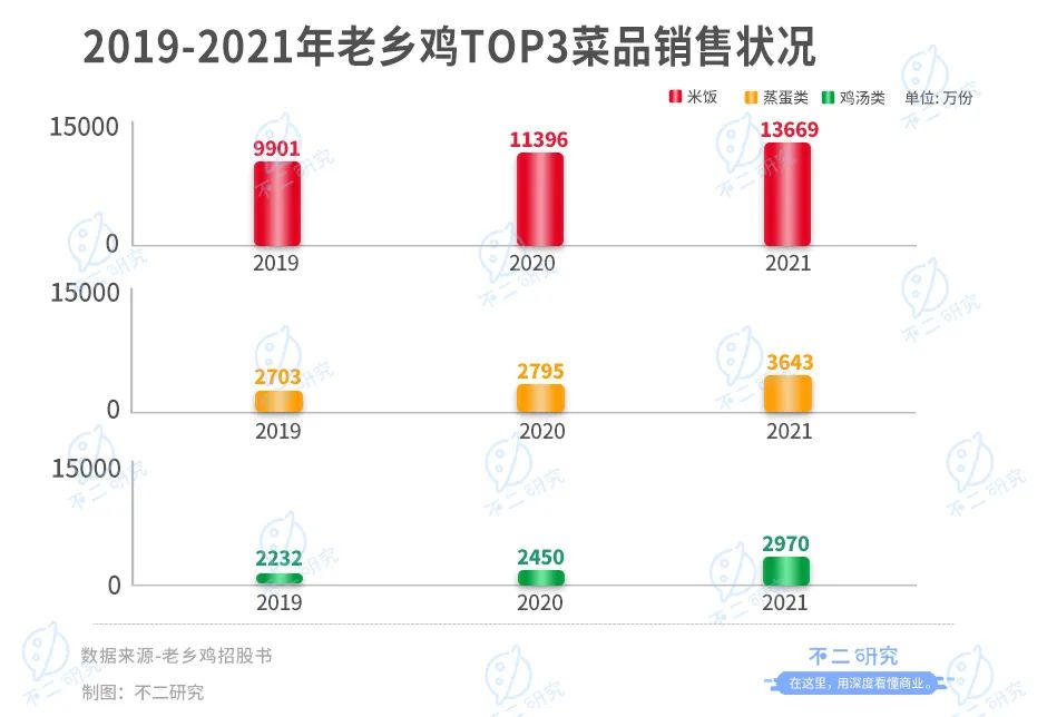 從產(chǎn)品構(gòu)成來看,老鄉(xiāng)雞以肥西老母雞湯產(chǎn)品為特色,但其最為暢銷的產(chǎn)品竟是米飯。2021年,老鄉(xiāng)雞銷售量Top3的菜品分別是米飯、蒸蛋和雞湯,分別售出1.37億、0.36億和0.30億份!