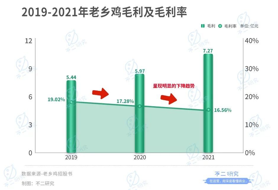 同時(shí),毛利率也顯示出老鄉(xiāng)雞的短板。根據(jù)招股書,2019-2021年,老鄉(xiāng)雞整體毛利率分別為19.02%、17.28%、16.56%,呈現(xiàn)明顯的下降趨勢(shì)。對(duì)此,老鄉(xiāng)雞在招股書在解釋稱是受原材料成本上升、人工成本上升等因素影響。