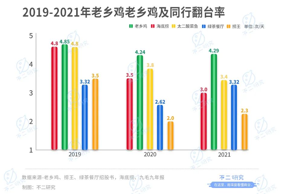 疫情之下、行業(yè)震蕩,餐飲企業(yè)的核心指標(biāo)——翻臺(tái)率遭嚴(yán)峻考驗(yàn)。根據(jù)招股書數(shù)據(jù),2019-2021年老鄉(xiāng)雞翻臺(tái)率分別為4.85次/天、4.24次/天和4.29次/天,整體處于下滑趨勢(shì)。不過作為快餐品牌,老鄉(xiāng)雞的翻臺(tái)率在行業(yè)內(nèi)仍然較高。根據(jù)年報(bào)及招股書,2019年~2021年,海底撈翻臺(tái)率分別為4.8次/天、3.5次/天和3.0次/天;太二酸菜魚翻臺(tái)率4.8次/天、3.8次/天和3.4次/天;綠茶餐廳翻臺(tái)率為3.32次/天、2.62次/天和3.32次/天;撈王翻臺(tái)率為3.5次/天、2.0次/天和2.3次/天。