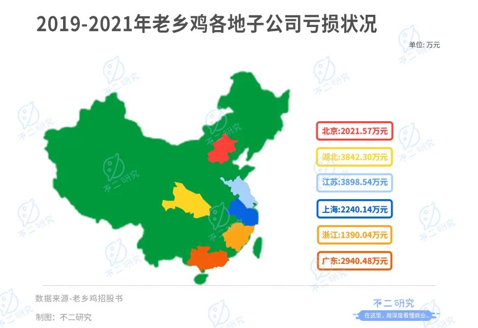 門店擴(kuò)張不夠的窘境,阻礙了該模式的全國化推廣,又將進(jìn)一步分化區(qū)域間盈利能力。除安徽總部外,老鄉(xiāng)雞其余各地的子公司均已陷入虧損。招股書顯示,2021年湖北、江蘇、上海、浙江、廣東、北京的老鄉(xiāng)雞子公司分別虧損3842.30萬、3898.54萬、2240.14萬、1390.04萬、2940.48萬和2021.57萬元,合計(jì)1.63億元。