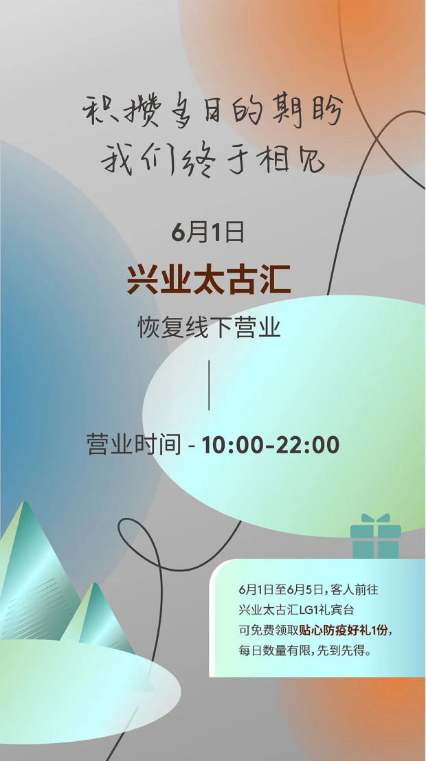 6月1日起,興業(yè)太古匯恢復(fù)營業(yè),營業(yè)時間10:00-22:00。