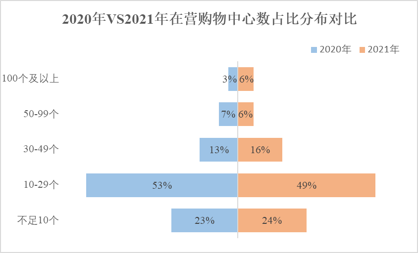 圖1 2020年VS2021年在營購物中心數占比分布對比