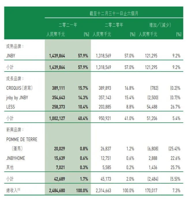 如今,JNBY仍是江南布衣集團(tuán)的營收主力。2021/2022中期,該品牌貢獻(xiàn)收入14.40億元,占比公司當(dāng)?shù)乜偁I收的57.9%。