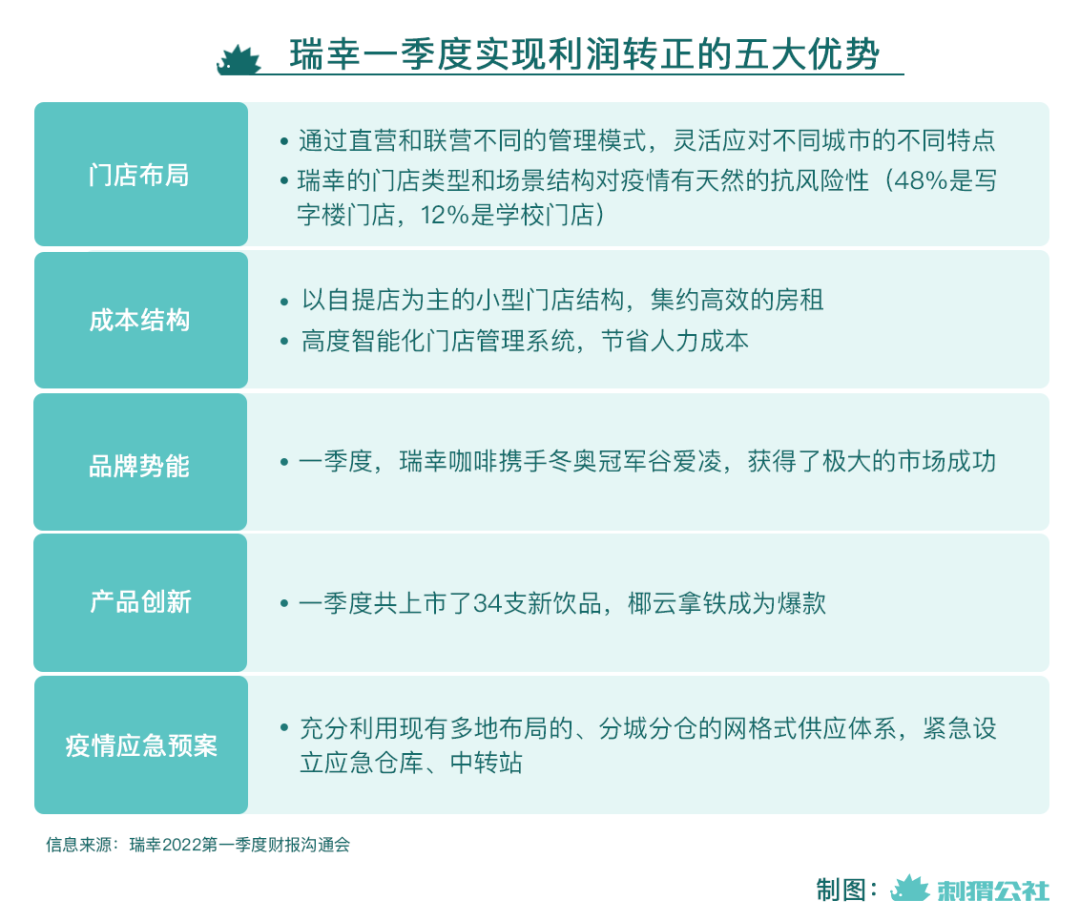 既然瑞幸已經(jīng)成為“新瑞幸”,那我們就不再重提“老瑞幸”時(shí)期的舊話。僅看第一季度,郭謹(jǐn)一將瑞幸的成功總結(jié)為五點(diǎn):科學(xué)的門店布局、合理的成本結(jié)構(gòu)、品牌勢(shì)能助推、持續(xù)的產(chǎn)品創(chuàng)新能力和疫情下完善的應(yīng)急預(yù)案。