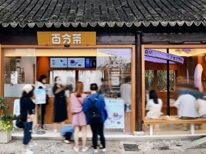 說回連鎖品牌布局,除了上文提到的茶顏悅色,蘇州品牌百分茶上個月也在平江路開了一家”游園驚夢“主題店。