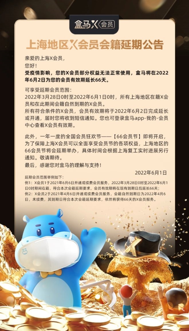 盒馬:上海地區(qū)X會(huì)員免費(fèi)延期66天