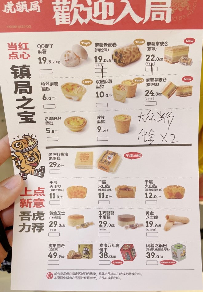 該店為標準店,門店設計沿用了他們一貫的“國潮”風,配色酷炫,復古字體與傳統(tǒng)老虎紋樣組合。店內(nèi)在售33余款商品,主打麻薯老虎卷、麻薯拿破侖、老虎打醬油蛋糕等。