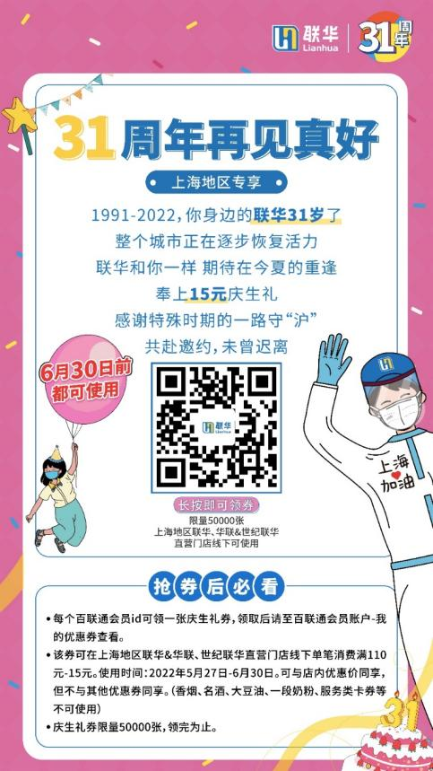 聯(lián)華股份將在31周年慶之際,提供三重優(yōu)惠,派發(fā)超過50萬張總價值近千萬的滿減券。消費者通過添加“聯(lián)小華”企業(yè)微信公眾號,分享近期到聯(lián)華線下消費的視頻或照片,即可獲得限量5元無門檻券。百聯(lián)通會員則可通過聯(lián)華官方微信號、社群等渠道領取“滿110 – 15”優(yōu)惠券。