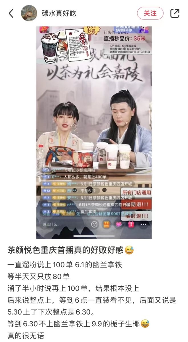 近日,長沙網(wǎng)紅飲品茶顏悅色進軍重慶開店后引發(fā)網(wǎng)友吐槽。據(jù)網(wǎng)友描述,茶顏悅色重慶門店首播,直播過程中一直溜粉,承諾的補單并沒有做到,秒殺產(chǎn)品與實際不一樣,針對這些情況有粉絲評論吐槽還被直播間拉黑。
