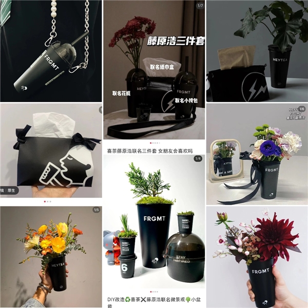 比如,飲品杯被改造成了花瓶、筆筒,保溫袋則搖身一變成為背包、紙巾盒等,從前被人們習(xí)慣性丟棄的飲品包材成為了日?裳h(huán)使用的潮流單品。此次合作所引發(fā)的大量UGC二創(chuàng)內(nèi)容,既展現(xiàn)了新茶飲消費(fèi)者自身個性態(tài)度與藤原浩所代表的的潮流文化的碰撞,也讓喜茶品牌的“靈感與酷”得到進(jìn)一步彰顯。