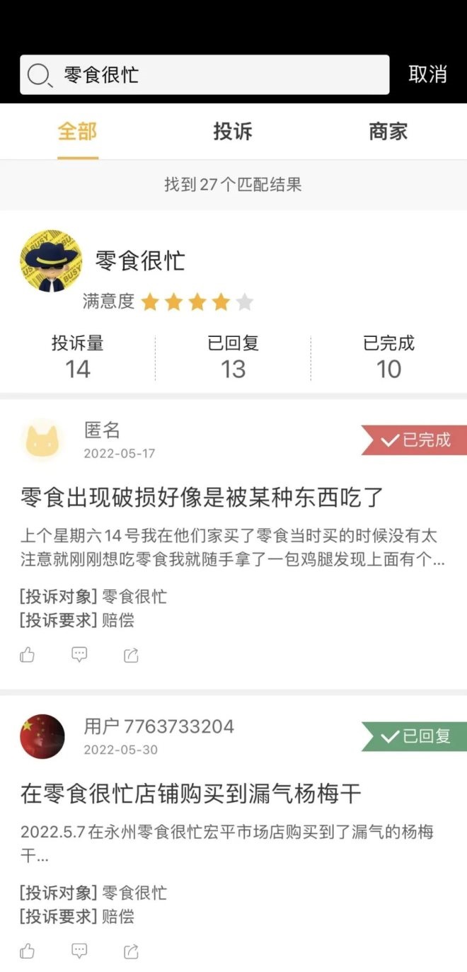 快速盈利的同時,零食集合店的產(chǎn)品質(zhì)量問題卻層出不窮。北京商報看到,零食很忙、零食有鳴、老婆大人—量販零食等品牌均出現(xiàn)在黑貓投訴平臺,投訴多與零食的安全、質(zhì)量相關(guān)。