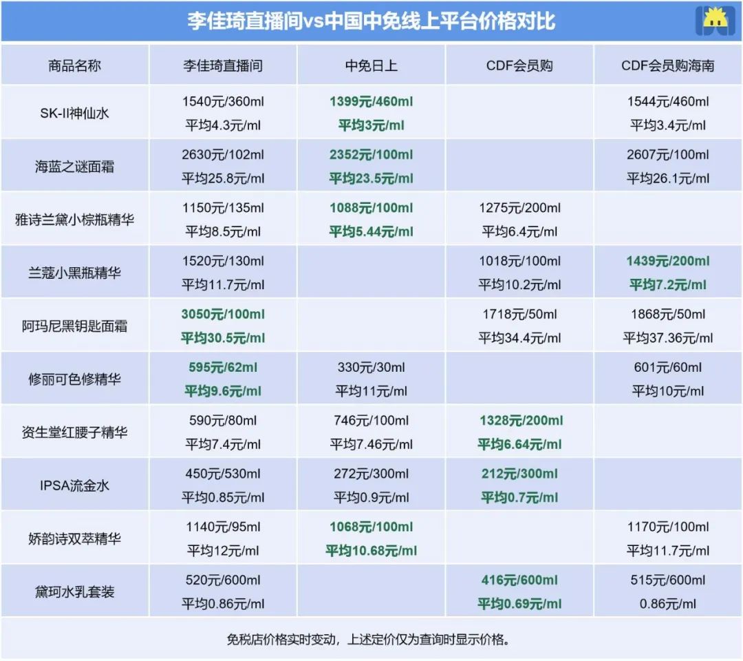 得益于渠道優(yōu)勢(shì),中免的線上平臺(tái)商品尤其是化妝品類目的國(guó)際品牌,相比與品牌旗艦店合作的李佳琦,價(jià)格優(yōu)勢(shì)明顯。