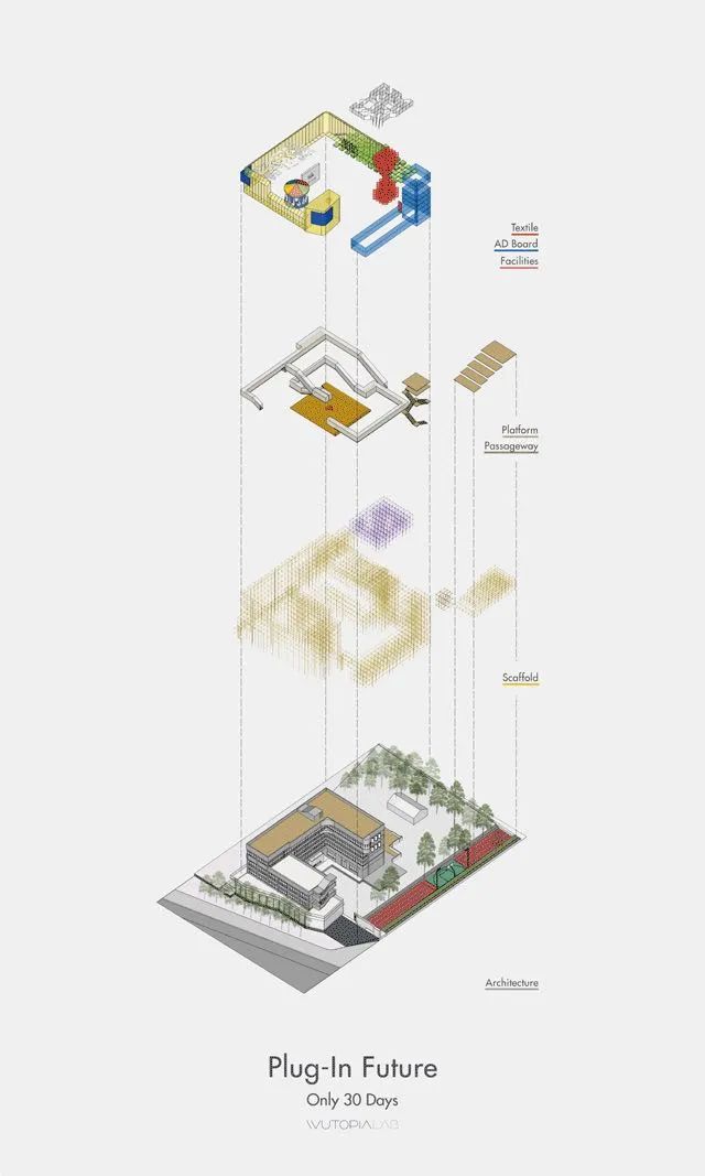 設(shè)計(jì)動(dòng)用 2.6 萬米腳手架,120 噸鋼材和布料,2054 米燈線,在極短的時(shí)間內(nèi),將曾經(jīng)的小學(xué)校園教學(xué)樓改造成一個(gè)顏色斑斕、植物縈繞、頗具魔幻色彩的建筑,成為一座只存在30天23小時(shí)59分59秒的「虛擬城市」。
