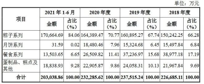 據(jù)招股書顯示,2018 年至2020年、以及2021年上半年,粽子業(yè)務(wù)的營收占比分別為66.28%、67.74%、70.77%以及84.06%。如果五芳齋成功上市,那么它將是A股市場里唯一一家以粽子這一時令食品為主營的企業(yè)。