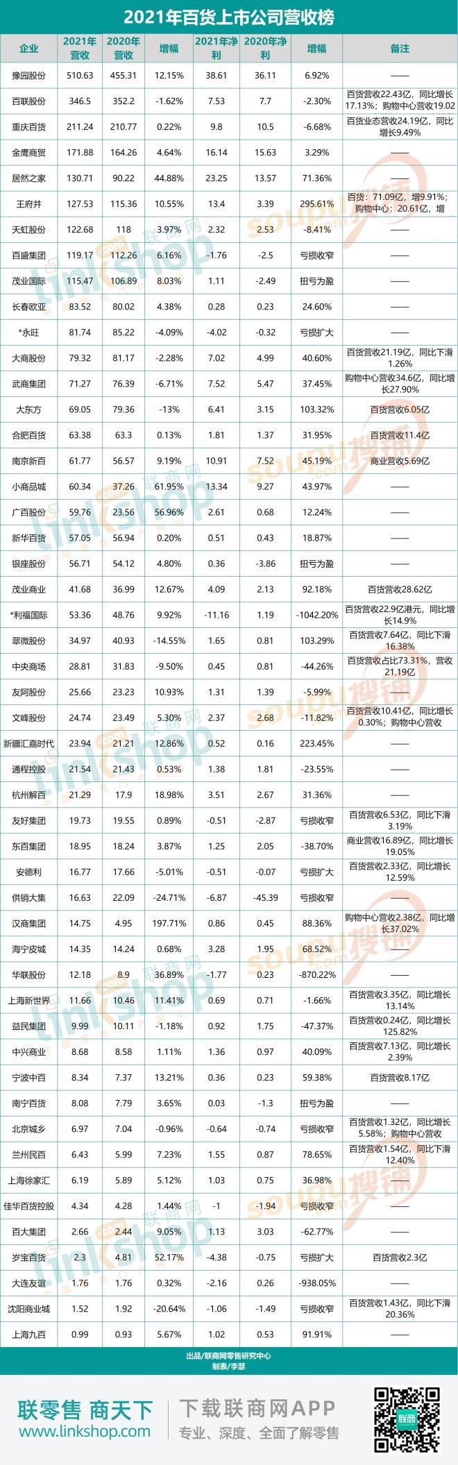 聯(lián)商網(wǎng)零售研究中心選取50家百貨上市公司2021年業(yè)績(jī)數(shù)據(jù),一窺2021年百貨表現(xiàn)。