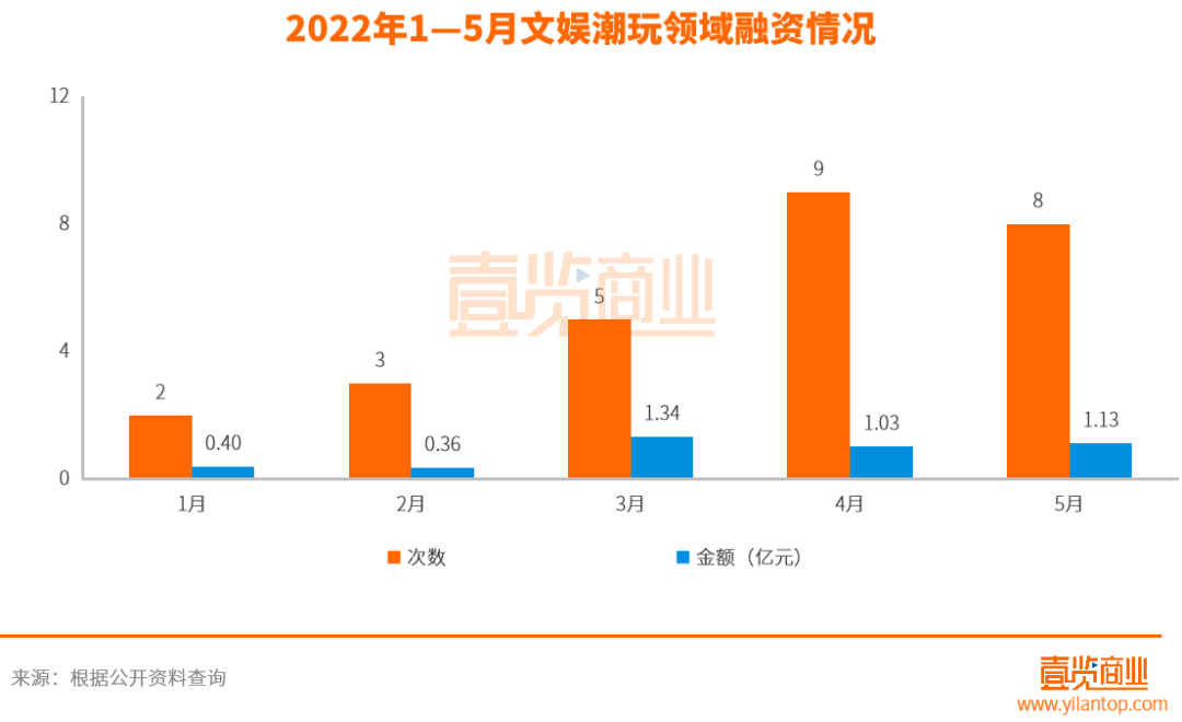 至于文娛潮玩,融資事件數(shù)量同服務(wù)商領(lǐng)域類似,在今年的前五個月中均是穩(wěn)步走高。繼3起、4起、5起、7起之后,文娛潮玩領(lǐng)域在5月份獲得了8起融資事件事件,總?cè)谫Y金額同樣緩步上升,達到1.13億元。