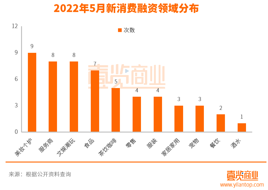 從行業(yè)來看,5月份的融資事件主要集中在美妝個護、服務(wù)商、文娛潮玩、食品領(lǐng)域上,各領(lǐng)域的融資事件分別達到9起、8起、8起、7起。結(jié)合四月份融資情況來看,消費領(lǐng)域在5月份中融資情況變化最大的領(lǐng)域為美妝個護和餐飲。