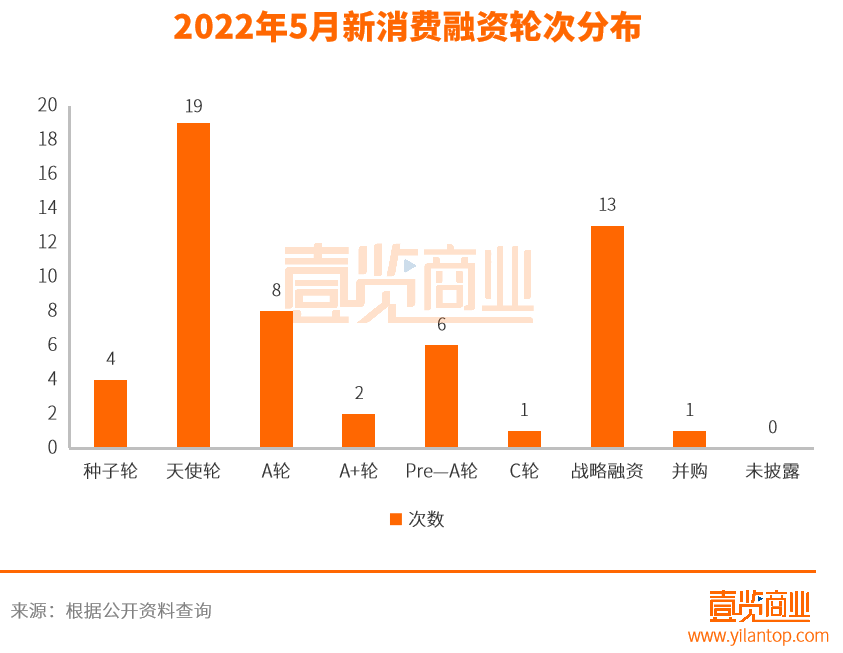 從融資輪次來看,5月份新消費品牌融資主要集中在天使輪和戰(zhàn)略融資,分別共發(fā)生了19起、13起?傮w來講,新消費品牌融資事件大部分依舊處于早期階段。