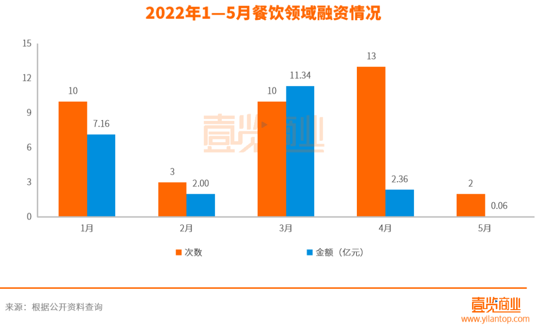 據(jù)壹覽商業(yè)統(tǒng)計數(shù)據(jù)顯示,2022年1-4月,餐飲領(lǐng)域的融資情況為:融資事件數(shù)量依次分比為9起、4起、10起、13起;總?cè)谫Y金額依次分比為7.16億元、2億元、11.43億元、2.36億元。而5月份,餐飲領(lǐng)域僅獲得2起融資事件,總?cè)谫Y金額為0.06億元。相比此前的節(jié)節(jié)爬升,餐飲領(lǐng)域在5月份跌回了“谷底”。