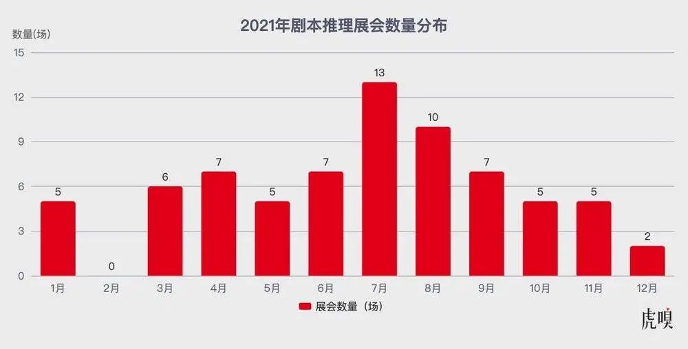 以 2021 年全年劇本推理展會數(shù)據(jù)為例,全國舉辦的劇本殺展會累計(jì) 72 場;從單月舉辦 / 規(guī)劃的場數(shù)來看,展會舉辦場數(shù)在上半年呈逐步上升趨勢,以 7 月舉辦的 13 場為峰值,下半年舉辦場數(shù)呈逐步下降趨勢。