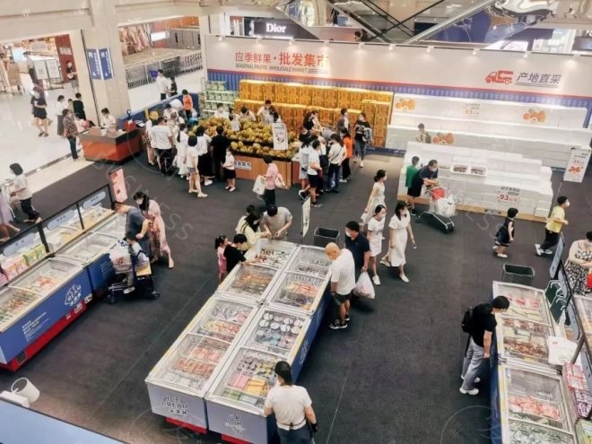據(jù)悉,位于胖東來許昌時代廣場店中庭的“批發(fā)市集”是規(guī)模最大的一場,面積約400平方米,以整箱集中陳列和大堆頭營造出貨滿堆山的銷售氛圍。同時,“批發(fā)市集”有單獨的結(jié)算通道,無需進入超市,可實現(xiàn)即挑即買即走,購買非常便捷。