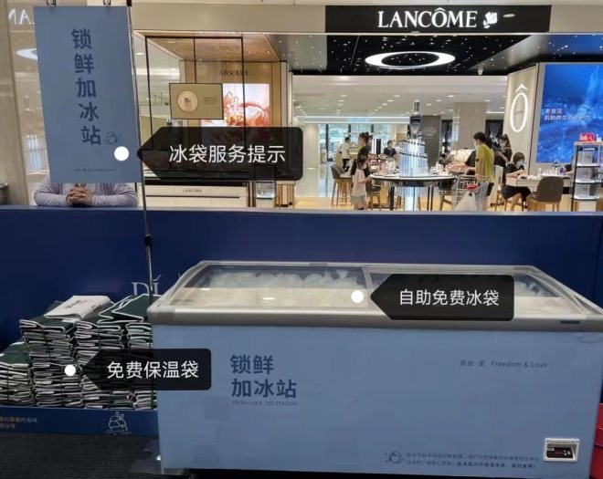 賣場內(nèi)還有多個鎖鮮加冰站,供顧客自助取用,還有免費保溫袋為需求量大和路程較遠的顧客提供商品品質(zhì)和口感的保障。
