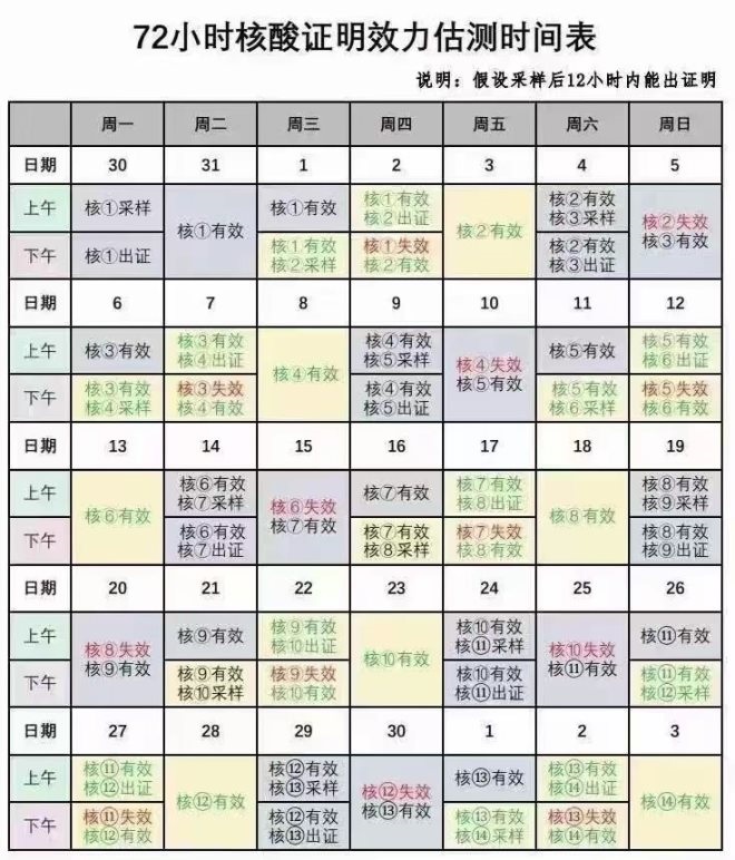 5月31日在朋友圈看到過一張《72小時(shí)核酸證明效率估測(cè)時(shí)間表》。