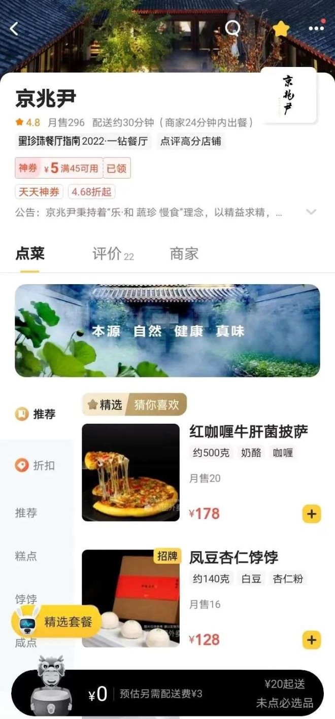 外賣(mài)新商家的名單,甚至包括全球唯一的米其林三星素食餐廳京兆尹。這家坐落于北京雍和宮對(duì)面,人均價(jià)格超過(guò)1000元的餐廳,在5月中旬上線(xiàn)外賣(mài),主要售賣(mài)主食、自制糕點(diǎn)和300到600元的套餐。