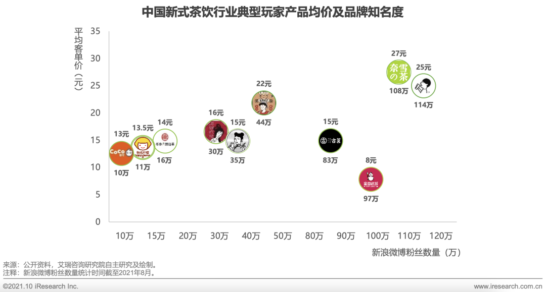 一方面,從產(chǎn)品定價層面看,高到20、30元,低到10元以下,價格帶的各個區(qū)間都已涌現(xiàn)出極具代表性的領(lǐng)頭羊。喜茶與奈雪的茶客單價傲視群雄,構(gòu)成了貫行高端路線的雙巨頭?蛦蝺r較低的蜜雪冰城主攻下沉市場,覆蓋了廣泛而龐大的客戶群體。