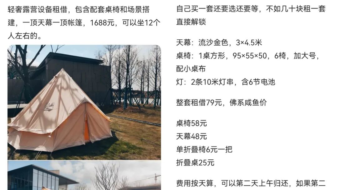 閑魚上,租借露營設(shè)備標(biāo)價最低是79元,最高的則是1688元,兩者包含的裝備和服務(wù)不同:79元的套餐來自成都的一位商家,包含一塊天幕、一張桌子和6張椅子,還有燈串和電池,商家并不提供額外服務(wù);1688元的套餐來自舟山,包含了一頂帳篷、一塊天幕和配套桌椅,可以坐下12個人,商家表示還能搭建各種配套場地,基本能滿足舉辦各類活動的需求。