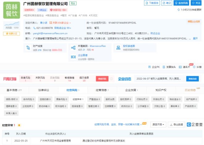 Manner咖啡廣州公司被列為經(jīng)營(yíng)異常
