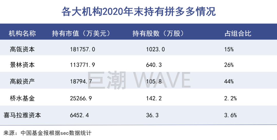 黃崢大手筆清算手中股份之前,一系列知名投資機構(gòu)在2020年四季度大手筆購入拼多多的股份,數(shù)量以億美元計算。其中高瓴資本和景林資產(chǎn)合計買入約30億美元,另外高毅資產(chǎn)、橋水、喜馬拉雅等機構(gòu)也有不同金額的買入。