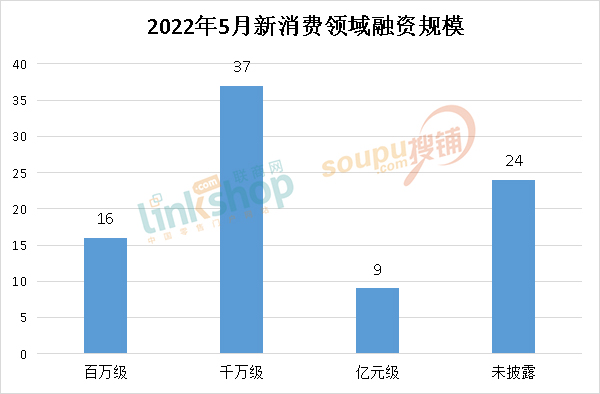 從融資規(guī)模來看,5月份融資以百萬級和千萬級為主,分別達到16和37次。百萬級融資主要集中在天使輪階段,以細分賽道的中小品牌為主。