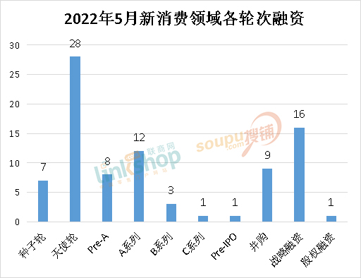 從融資業(yè)態(tài)分布來看,5月份食品飲料領域占比最大,共發(fā)生17起融資事件,但相較4月份略有回落。在餐飲、美妝之外,元宇宙、零售等領域的融資數(shù)量大幅上升。