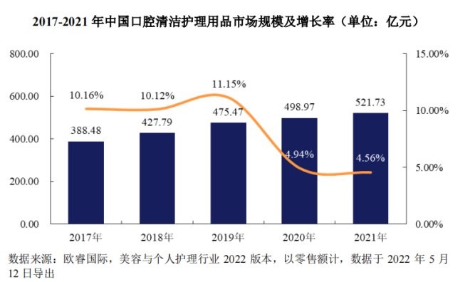 近年來,中國口腔護理市場快速發(fā)展。 招股書顯示,從我國口腔清潔護理用品行業(yè)市場規(guī)模來看, 2017-2021 年我國口腔清潔護理用品行業(yè)市場規(guī)模呈逐年上升趨勢,年均復(fù)合增長率為 7.65% 。 2021 年我國口腔清潔護理用品行業(yè)市場規(guī)模為 521.73 億元,較 2020 年同比增長 4.56% 。