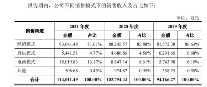 2021年登康口腔經(jīng)銷模式收入占比81.61%,同2020年和2019年相比,收入占比下降明顯,登康口腔表示,主要原因是2021年積極開拓電商業(yè)務(wù),電商模式收入快速增長所致。