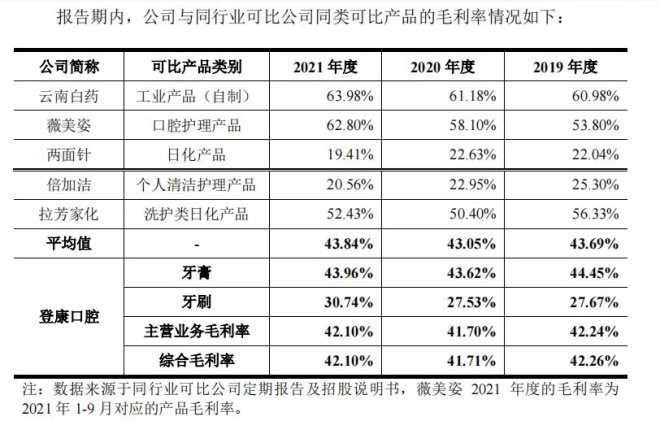 與同行公司相比,2019-2021年登康口腔綜合毛利率略高于可比公司平均值。對此,登康口腔表示,主要系各公司產(chǎn)品結(jié)構(gòu)、業(yè)務(wù)模式、客戶結(jié)構(gòu)等方面存在差異所致。公司綜合毛利率高于云南白藥、兩面針、倍加潔,低于薇美姿、拉芳家化,毛利率處于合理區(qū)間。