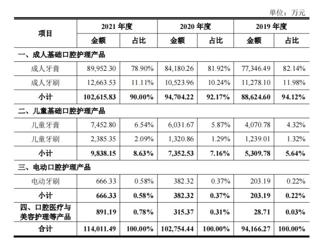 從收入構(gòu)成來看,登康口腔的大部分收益來自牙膏產(chǎn)品,2019年至2021年牙膏業(yè)務(wù)收入的占比分別為86.46%、87.79%和85.44%。牙刷緊隨其后,電動口腔護理產(chǎn)品(即電動牙刷)和口腔醫(yī)療與美容護理等新品類營收占比仍然偏低。