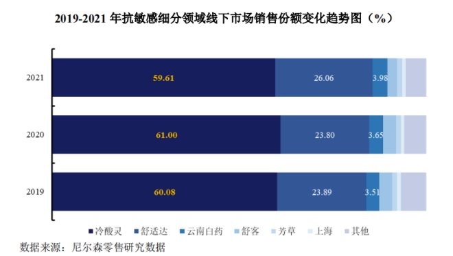 “冷熱酸甜,想吃就吃”——這句膾炙人口的廣告語將“冷酸靈”這個國產(chǎn)牙膏品牌帶進了千家萬戶的視野。作為登康口腔的核心品牌,招股書顯示,2019-2021年,冷酸靈在抗敏感細分領(lǐng)域線下市場分別占60.08%、61.00%和59.61%。根據(jù)尼爾森2021年線下零售統(tǒng)計數(shù)據(jù),冷酸靈牙膏市場零售額份額位居行業(yè)第四、本土品牌第二。冷酸靈牙刷市場零售額份位居行業(yè)第五、本土品牌第三。