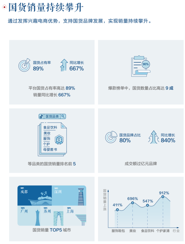 同樣受益于此的還有國貨:《2021抖音電商國貨發(fā)展年度報告》中顯示,平臺堅持對國貨傾斜資源,借助建興趣電商購物場景、設(shè)立特色貨品品類榜、推出“抖音超級新品”等舉措,成功帶動了國貨增長。平臺內(nèi)國貨占有率已高達89%,銷量同比增長達到667%。其中擴張較快的個護家清領(lǐng)域,過去一年的增長幅度達到了9倍有余。