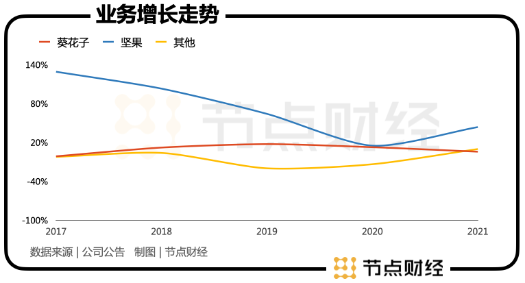 堅(jiān)果業(yè)務(wù)與瓜子業(yè)務(wù)面臨相似的問(wèn)題。堅(jiān)果業(yè)務(wù)已經(jīng)陷入了增長(zhǎng)困境。在2017年之后的幾年里,堅(jiān)果業(yè)務(wù)的增速只在2021年實(shí)現(xiàn)了同比上漲,從2020年的15.14%反彈至43.82%,其余時(shí)間都在下滑。