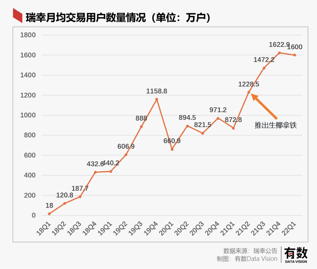 用戶數(shù)的觸頂跟爆款有很大的關(guān)系,在生椰拿鐵爆火后的次月,單月賣了一千萬杯,爆款帶來的一千萬杯是瑞幸能夠有效提升用戶數(shù)的關(guān)鍵所在。