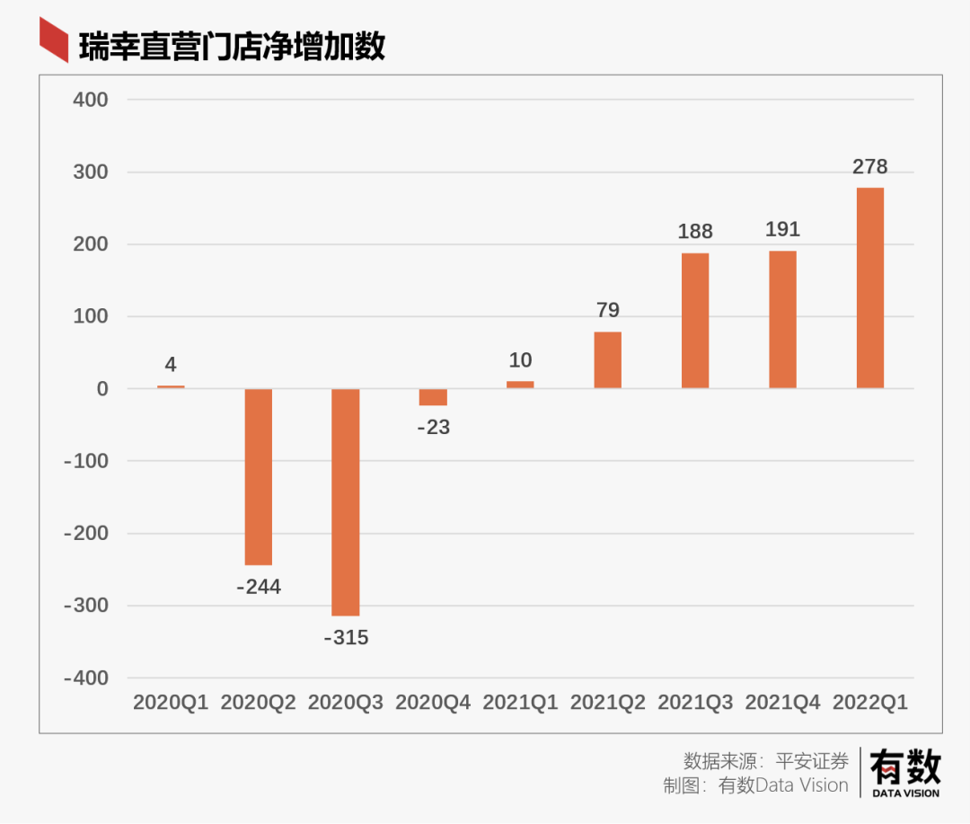從直營門店來看,瑞幸的直營門店基本處于負(fù)增長狀態(tài),但在出了爆款后的那一季度,不論是直營門店數(shù)量都開始顯著增加。