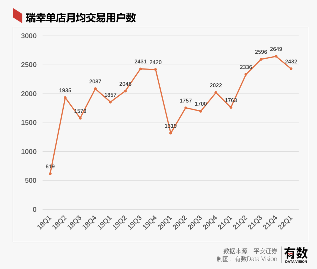 同季度,瑞幸的月均交易用戶首次突破暴雷前的數(shù)量達(dá)到1228萬戶的新高,且在一年內(nèi)不斷增長屢創(chuàng)新高。今年1季度則因?yàn)槿鹦抑麝嚨匾欢城市的疫情反復(fù),而有所下滑。