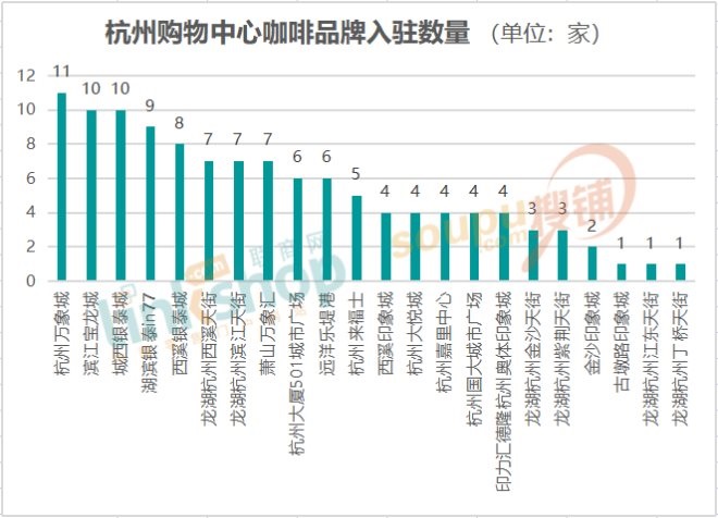 注:該圖表僅統(tǒng)計(jì)數(shù)量≥2家的咖啡品牌,未選入的咖啡品牌在杭購(gòu)物中心門店數(shù)量均為1家。