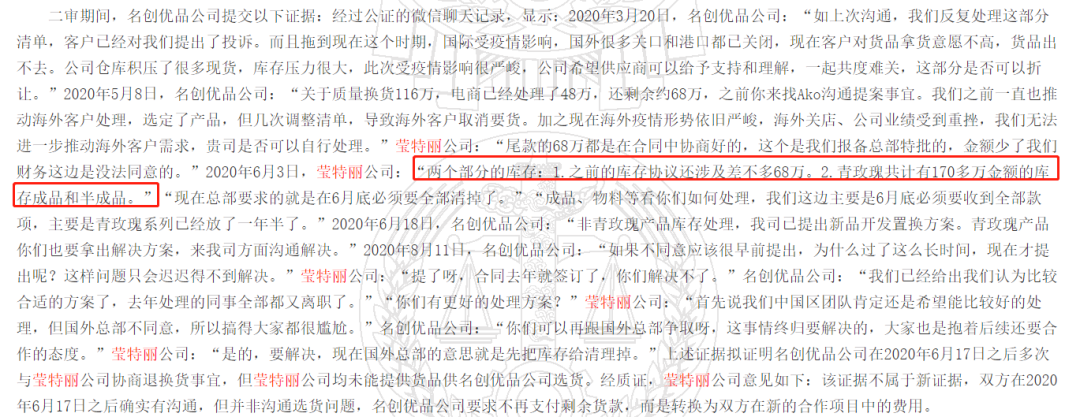 在該案中,根據(jù)二審期間名創(chuàng)優(yōu)品提交的聊天記錄證據(jù),瑩特麗曾提到:“兩個(gè)部分的庫(kù)存:1.之前的庫(kù)存協(xié)議還涉及差不多68萬(wàn)。2.青玫瑰共計(jì)有170多萬(wàn)金額的庫(kù)存成品和半成品!