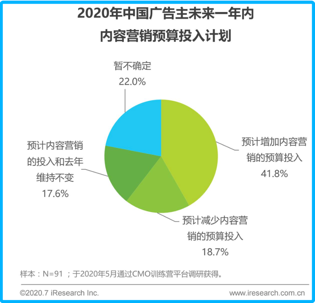 艾瑞咨詢報告顯示,即便是在營銷環(huán)境充滿不確定的2020年,仍有41.8%的受訪廣告主愿意增加內(nèi)容營銷預(yù)算。