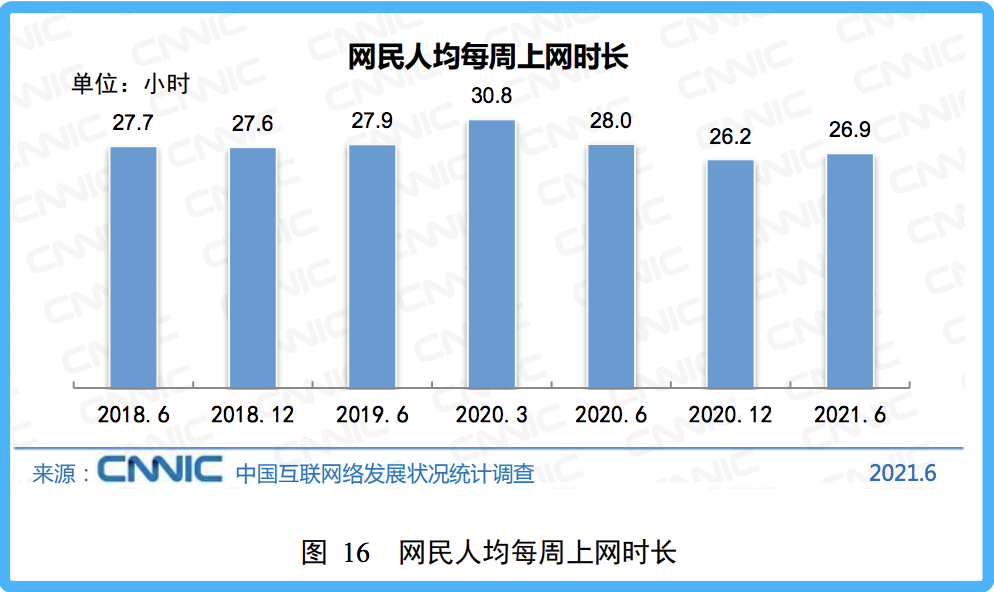 截至2021年6月,中國網(wǎng)民使用手機上網(wǎng)的比例已經(jīng)高達99.6%;而使用電視上網(wǎng)的比例僅為25.6%,不及臺式電腦(34.6%)和筆記本電腦(30.8%)。從上網(wǎng)時長看,網(wǎng)民人均每周上網(wǎng)26.9小時,雖較2018年、2019年同期有所下降,但依然保持較高停留時間。